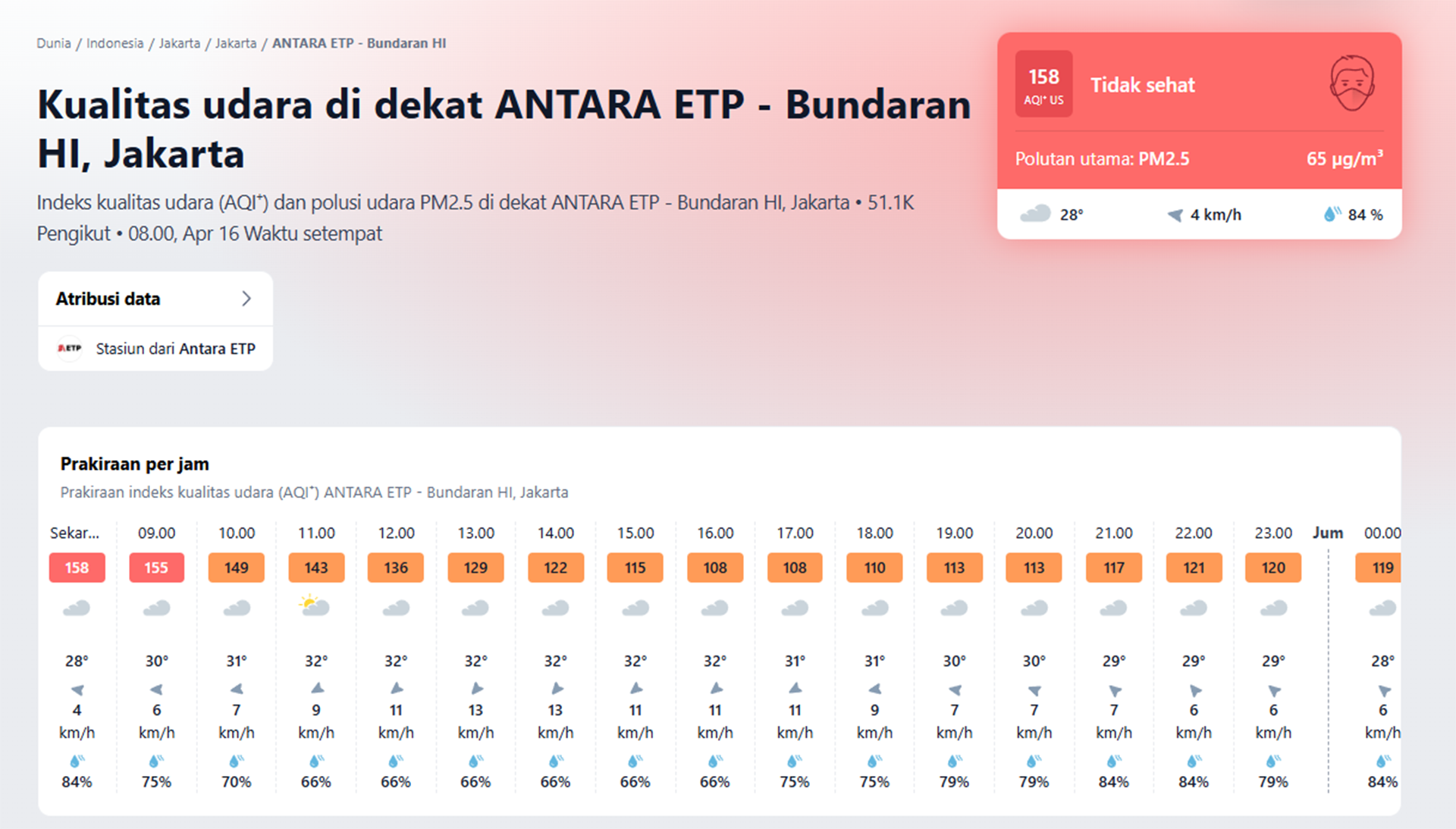 Jakarta, Batas.id, Dari pantauan website kualitas udara iqair, menunjukan saat ini kualitas udara di Jakarta terutama Sudirman, Bundaran HI dan sekitarnya terpantau Merah, dengan Air Quality Index (AQI) sebesar 154, dengan tingkat polusi PM 2.5, yang dikategorikan Tidak Sehat. Di sarankan untuk menggunakan masker jika berpergian ke daerah tersebut.