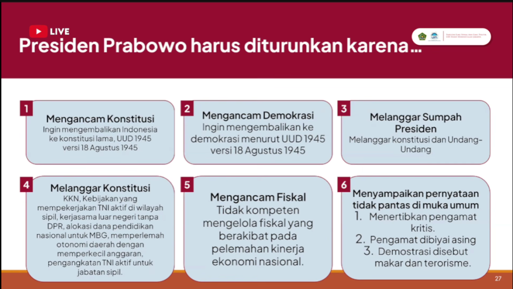 - Melanggar Konstitusi (Kebijakan) – Termasuk isu KKN, peran militer di sipil, dan kebijakan tanpa DPR.
